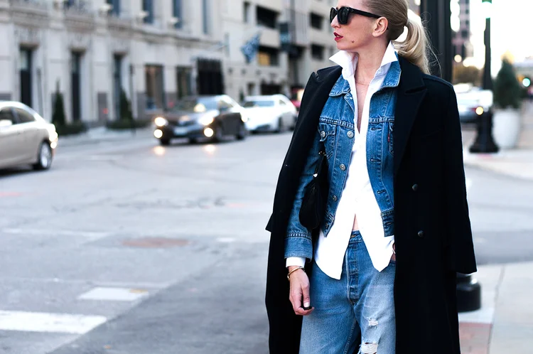 This particular style of denim has been my go-to for a couple of years. I have a fashion history of reaching for slouchy, androgynous, beat up denim and destructed Levi 501s are my favorite way to get that look. Denim on denim (Canadian tuxedo, anyone?) felt crisp and purposeful with a slick white shirt and an oversized boyfriend jacket by Pendleton. Unfussy gold jewelry and black accessories are an elegant finish to my down-and-dirty denim.