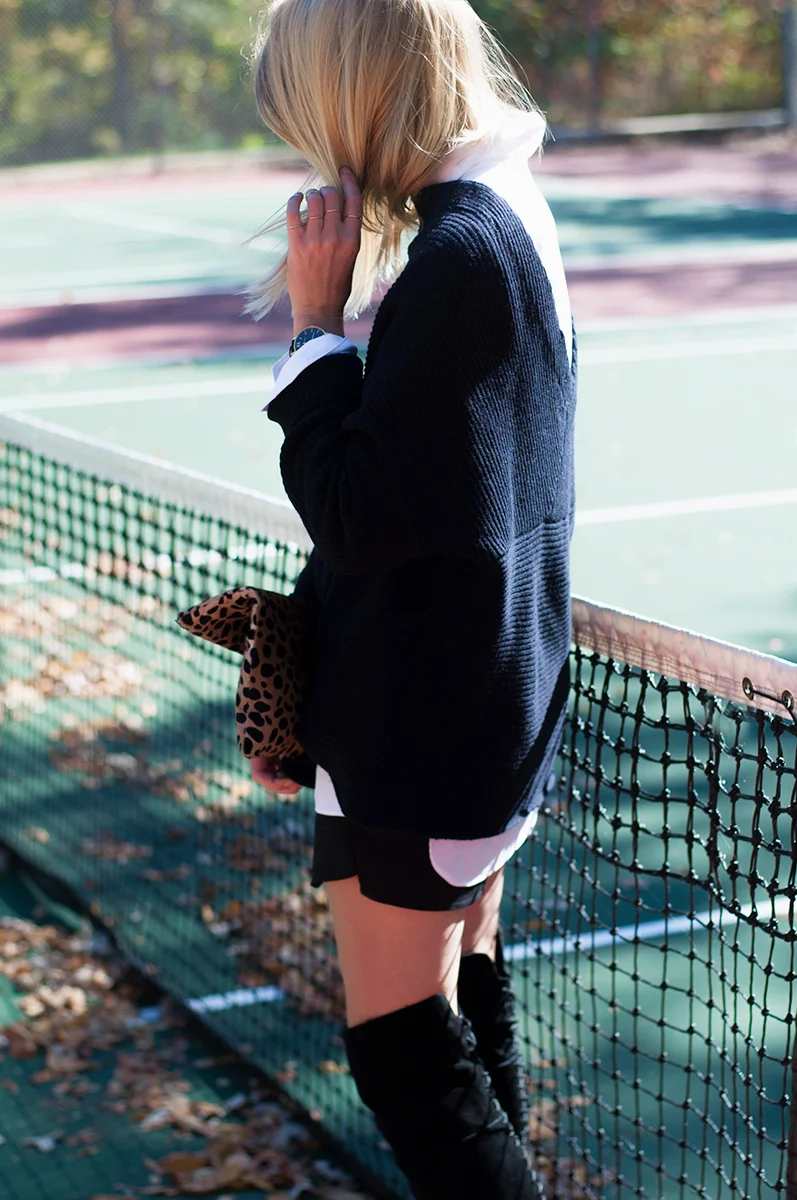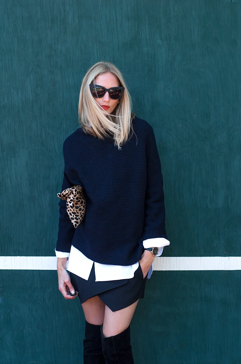 Sweater: Zara (Similar, Love this one too!) // Shirt: J Crew // Skorts: Zara (Similar) // Boots: Aldo // Clutch: Clare V. // Watch: Olivia Burton // Rings: Forever 21 // Earrings: Nasty Gal // Sunglasses: Quay